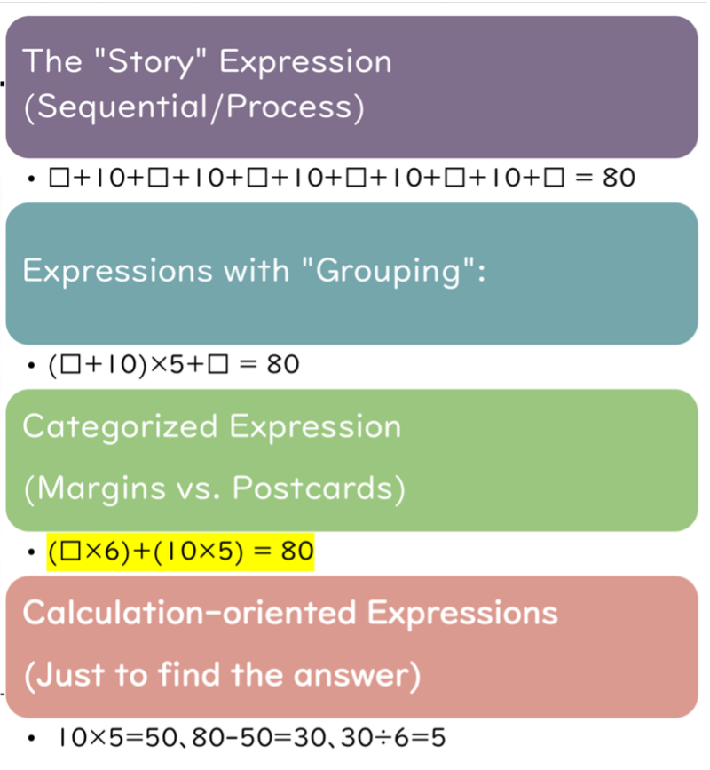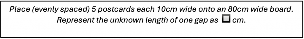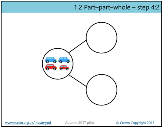 The Japanese approach is a subtle but important difference, improvement in my opinion, to the UK’s NCETM Part-Part-Whole model, introduced at Y1, referred to as the ‘cherry model’ which is non-linear. Teachers in the UK use the ‘cherry model’ in different orientations and this representation does not have that natural flow, offered by the Japanese approach, to the numberline. Additionally, the naming of the whole and parts in the Tape Diagram can be developed to preserve the proportionality of the story and in the use of inequalities, which is not evident in the ‘cherry model’.