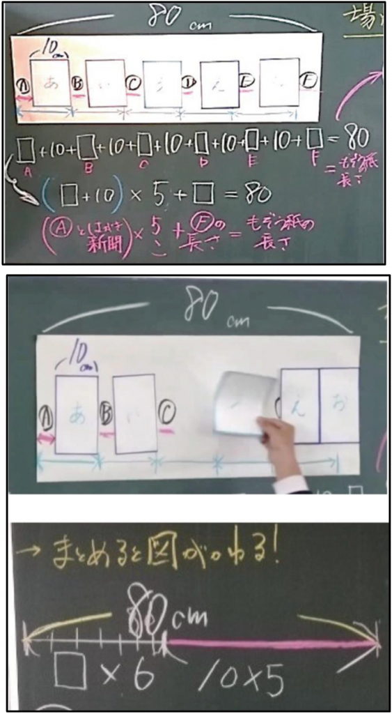 Example of how the problem developed can be seen in these ‘Bansho’ – board writing, the outcome of the children’s ideas and solutions.