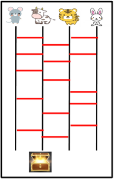 The Amida lottery, or Amidakuji (阿弥陀籤), is a traditional Japanese ladder-climbing game used to randomly pair items. It consists of vertical lines with horizontal “legs” connecting adjacent lines. Participants choose a top starting point and follow the path down, crossing horizontal lines (turning sideways) to reach a resulting end point.