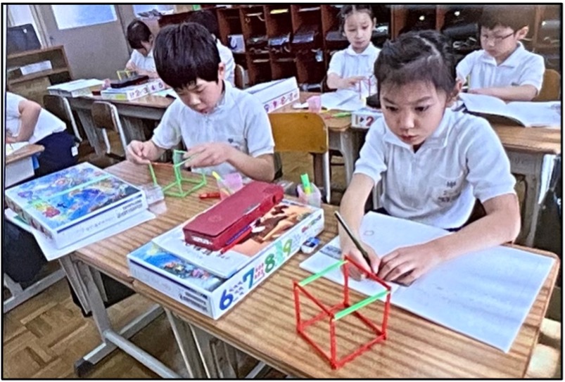 Four areas of mathematics are identified in the Japanese curriculum – Number & Calculation, Shape, Measurement/Change & Relationship and Data Utilisation. The government provide their approved text books for every child to keep, the content of which is trusted by the teachers and used to plan the daily 45 minute mathematics lessons. There is a notable absence of a deck of PPT slides provided, teachers craft their lessons based on the text book and reflect on their effectiveness in the classroom through the lesson study approach. The text book may not be used in the lesson but is available for children to use outside of the lesson. Also of note is each child is provided with their individual box of ‘resources’, manipulatives needed for the lessons.