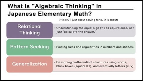 The curriculum focus of the day was ‘Developing Algebraic ways of Thinking in Elementary Schools’. Children thinking is a critical feature of the Japanese lessons, and generally the allocation of time given to develop and secure specific concepts is more than in the UK. Algebraic Thinking is deeply embedded in the realms of ‘Number & Calculation’ and ‘Change & Relationships’, with Relational Thinking, Pattern Spotting and Generalisation secured before formal algebra is introduced in Junior High school (Secondary phase in UK).